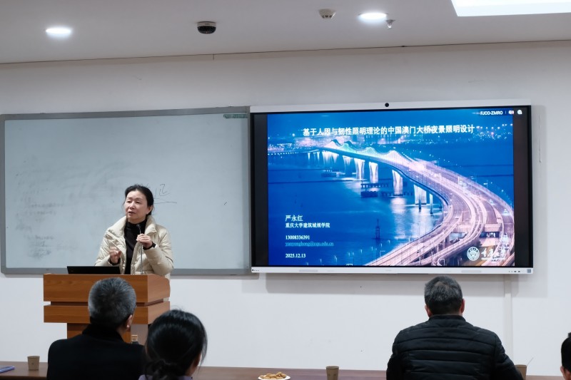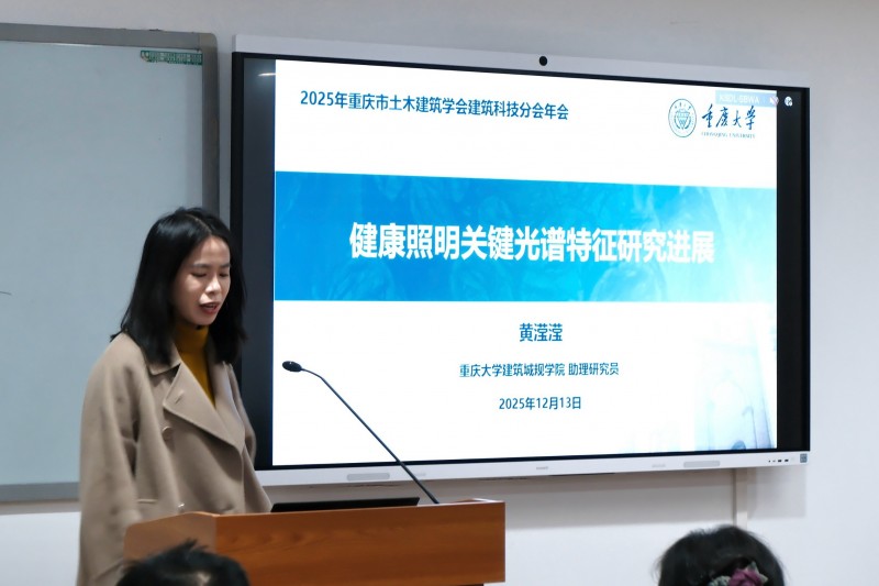 随后,多位参会嘉宾就个人、单位近年来的建筑科技新材料、新技术、新研究成果作报告分享。重庆大学建筑城规学院副院长冯驰教授介绍了绿色建筑与建成环境前沿交叉研究中心团队建设及成果,中国煤炭科工集团重庆设计研究院(集团)有限公司代表邬锦介绍了重庆“好房子”体系建设及绿色创新实践,长厦安基工程设计有限公司集团合伙人/集团设计总监蔡勇强分享了攀枝花红格·保险共享康养旅居示范基地设计项目,重庆大学建筑城规学院黄滢滢助理研究员介绍了健康照明关键光谱特征研究进展,四川美术学院公共艺术学院关杨讲师分享了古瓷器展陈光环境设计,重庆大学建筑规划设计总院刘晓莎教授级高工分享了基于城市双修背景下的山地城市更新实践,同方股份有限公司光电环境事业部张桐嘉经理、雷士照明集团代表何海总监分别介绍了近期企业完成的多项照明设计成果,重庆大学建筑城规学院严永红教授分享了基于人因与韧性照明理论的中国澳门大桥夜景照明设计,提出兼顾正常色觉与色觉缺陷人群的创新思路。本次会议还吸引了一批建筑科技领域青年学者,为不同方向的专家学者提供了思想交流的平台。