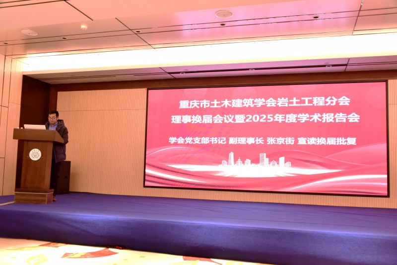 重庆市土木建筑学会党支部书记、副理事长张京街宣读学会关于岩土工程分会换届的批复。张京街副理事长充分肯定了岩土工程分会往届理事会的工作成绩,希望岩土工程分会新一届理事会在未来工作中,继续团结广大岩土工程科技工作者,积极开展学术研究与工程实践,为推动行业进步与助力重庆市城乡建设和高质量发展贡献更大力量。