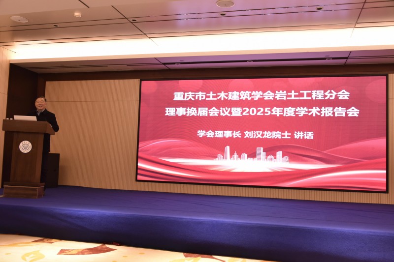 在第四届理事会成员选举产生后,会议特邀中国工程院院士、重庆市土木建筑学会理事长刘汉龙发表讲话。在讲话中,刘汉龙院士对岩土工程分会第三届理事会的工作成效给予了高度评价,并对分会顺利换届和新一届理事会的产生表示祝贺。刘汉龙理事长从学会全局发展的角度出发,对分会未来工作提出了指导性意见,勉励新一届理事会凝聚行业力量,勇于创新,为服务重庆乃至国家的重大战略与工程建设做出更大贡献。
